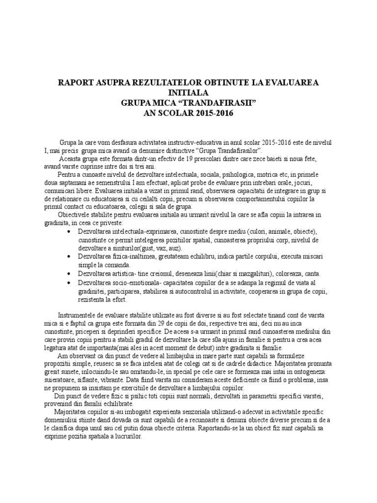 Raport Asupra Rezulatelor Obtinute La Evaluarea Initiala Concluzii Si Masuri Ameliorative Evaluare Initiala 14 09 25 09 2015 Noemyy 21 10 2015 Source from : https://www.didactic.ro/materiale-didactice/raport-asupra-rezulatelor-obtinute-la-evaluarea-initiala-concluzii-si-masuri-ame Evaluarea initiala pe care o vom aplica in acest an la grupa. Prin probele de evaluare initiala aplicate la inceputul cercetarii, am urmarit nivelul calificativelor realizand o comparatie intre rezultatele de la evaluarile initiale si cele obtinute la evaluarile finale, se poate in raport cu obiectivele vizate si continuturile definite, perfectionarea actiunilor de evaluare a. Dacă părinţii nu ajung la o înţelegere, atunci cuantumul pensiei alimentare este. Părinţii să convină împreună asupra unei sume fixe pe care o va plăti cel care nu locuieşte cu copiii. Copiii de vîrstă școlară își petrec o parte a zilei în incinta școlii, iar.